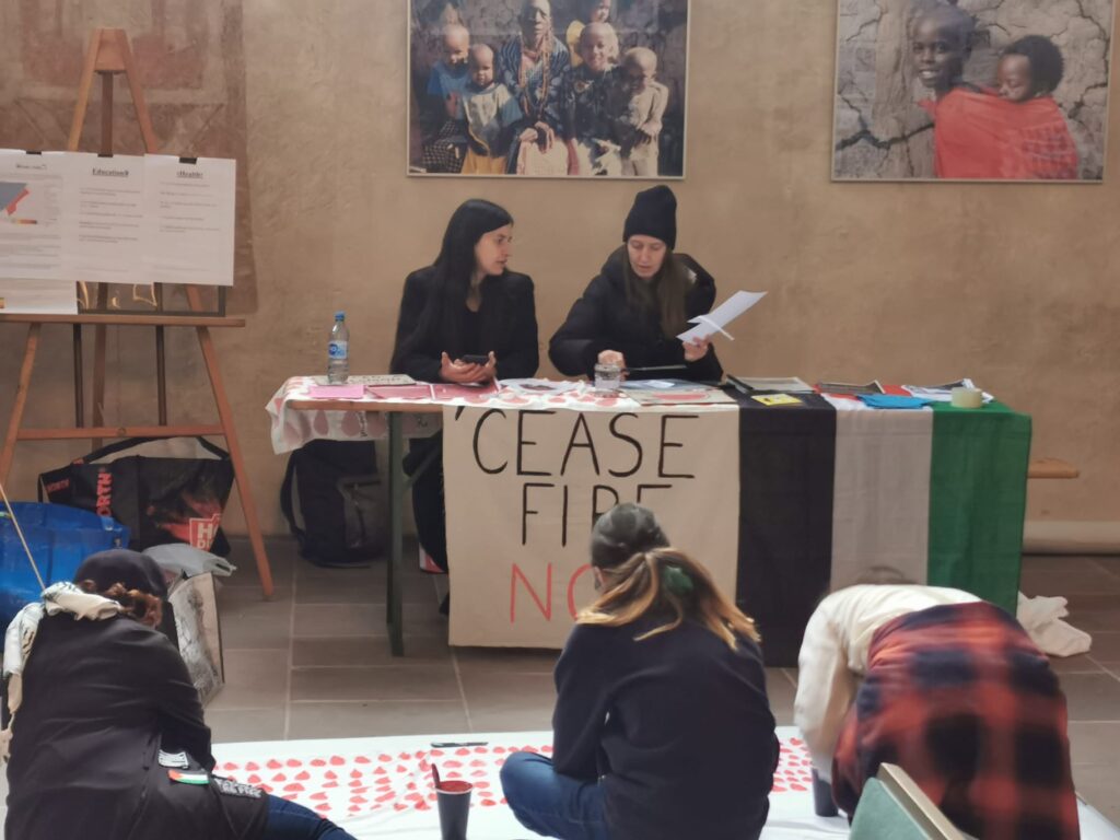 Ceasefire Now – Engagement der Studierenden für einen gerechten Frieden in Nahost. Im Hintergrund: Fotografien der Ausstellung TOGETHER – WE are the FUTURE.